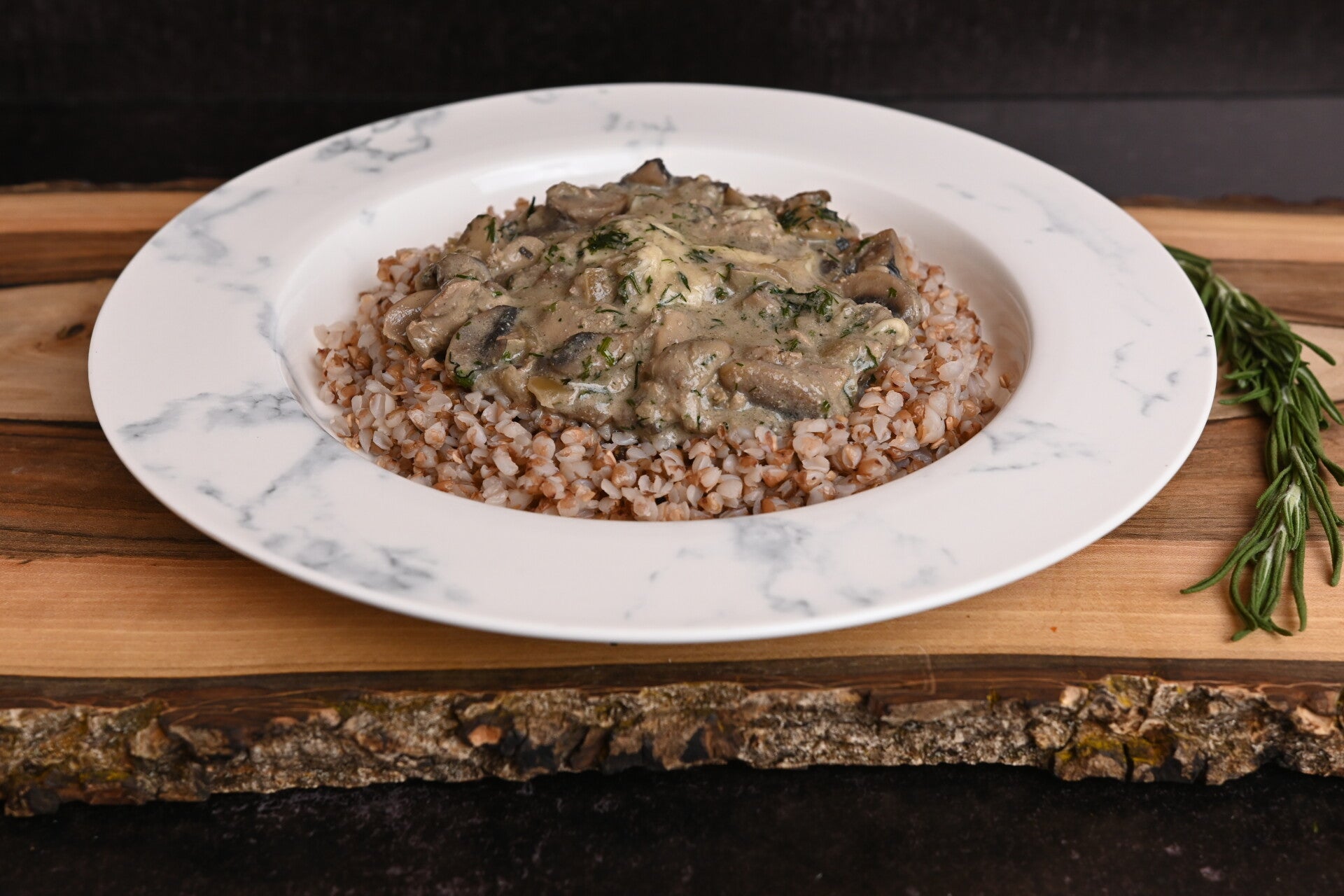 Печень куриная (28%), грибы шампиньоны (23%), жареный репчатый лук (репчатый лук, масло подсолнечное рафинированное, соль, перец чёрный молотый) (23%), сливки 30% (13%), питьевая фильтрованная вода, соевый соус, масло подсолнечное рафинированное, сыр чеддер, пшеничная мука высшего сорта, свежая зелень укропа, поваренная соль, перец чёрный молотый.
